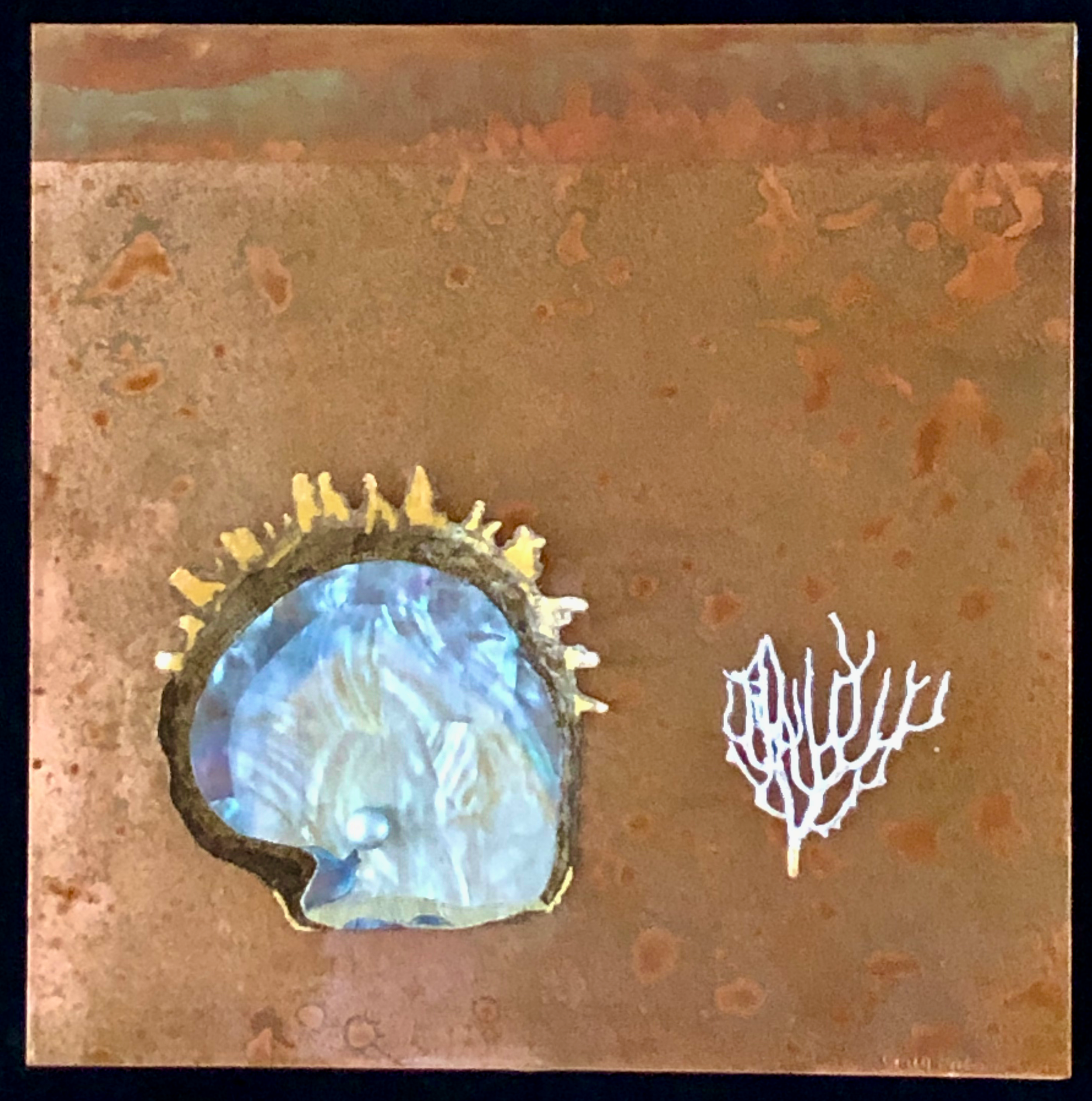 Subjects: The shell is pewter with black patina and gold leaf, and with white mother of pearl shell. The sea fan coral has golf leaf at its base and the “moon” is of silver leaf.